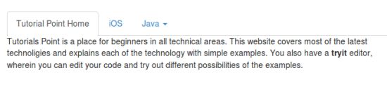 <div class="tab-content"> <div class="tab-pane fade in active" id="home">...</div> <div class="tab-pane fade" id="svn">...</div> <div class="tab-pane fade" id="ios">...</div> <div class="tab-pane fade" id="java">...</div> </div>
