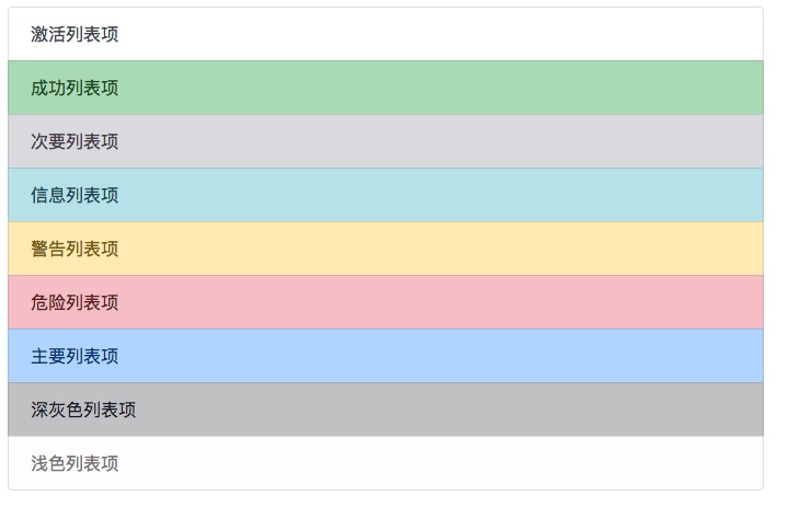 列表项目的颜色可以通过以下列来设置: .list-group-item-success, list-group-item-secondary, list-group-item-info, list-group-item-warning, .list-group-item-danger, list-group-item-dark 和 list-group-item-light: