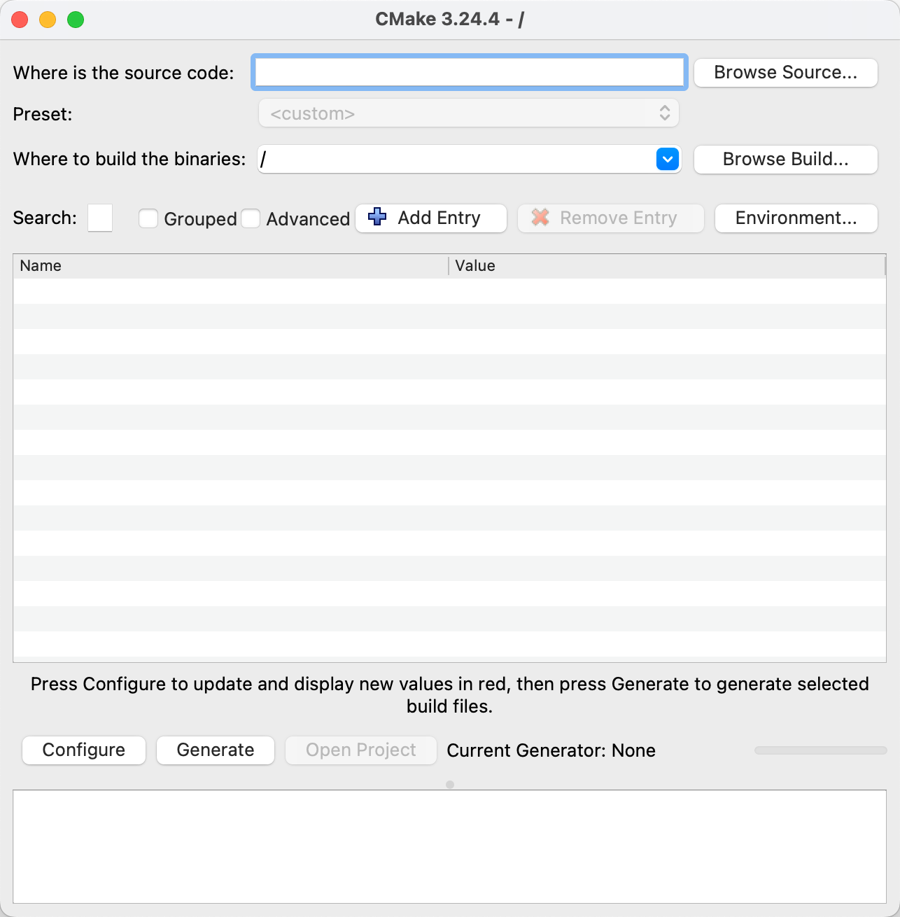 在 macOS 和 Linux 中,使用终端命令 cmake-gui 启动。
