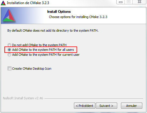 在安装过程中,可以选择将 CMake 添加到系统的 PATH 环境变量中(建议选择此选项,以便在命令行中直接使用 cmake 命令)。