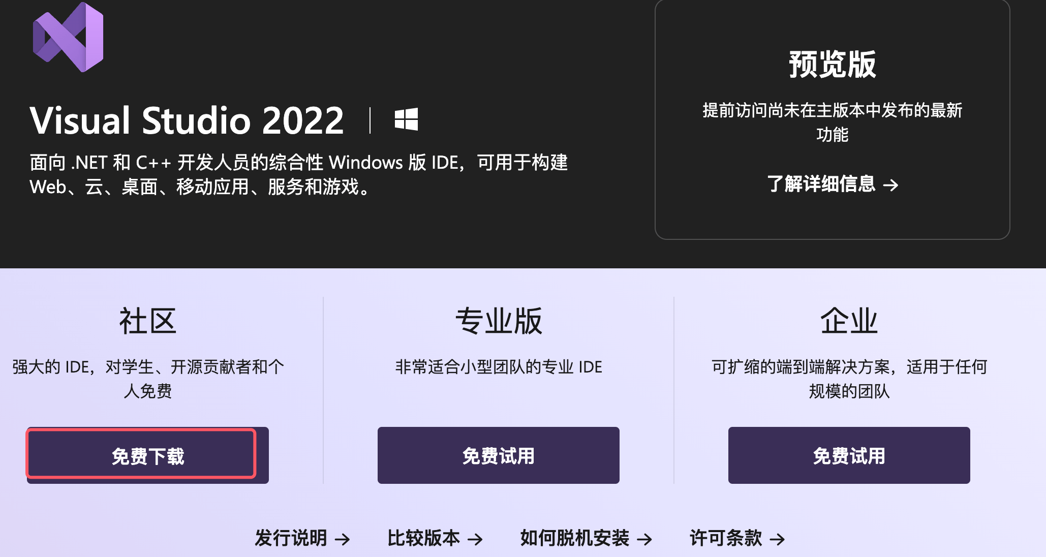 Visual Studio: 面向 .NET 和 C++ 开发人员的综合性 Windows 版 IDE,可用于构建 Web、云、桌面、移动应用、服务和游戏。