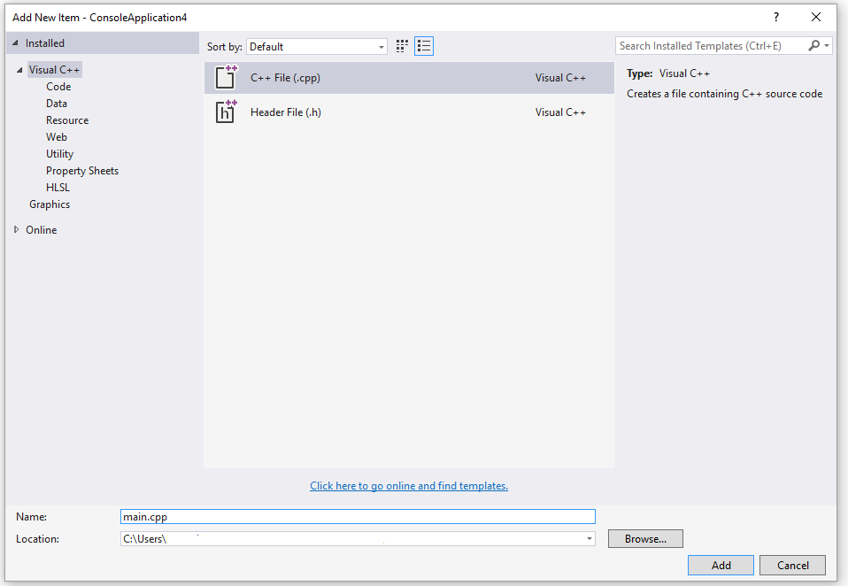 9、选择 C++ File 然后设置文件名为 main.cpp,然后点击 Add: