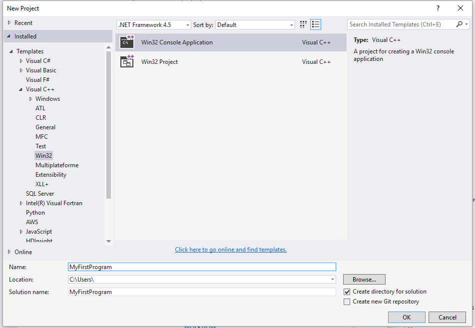 4、左侧列表选择 Templates -> Visual C++ -> Win32 Console Application,并设置项目名为 MyFirstProgram。