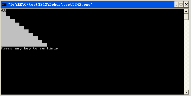 #include <stdio.h> #include <stdlib.h> #include <windows.h> int main(void) { SetConsoleOutputCP(437); char a=219; printf("\1\1\n"); for(int i=0;i<=9;i++) { for(int j=0;j<=i;j++) printf("%c",a); printf("\n"); } return 0; }小智