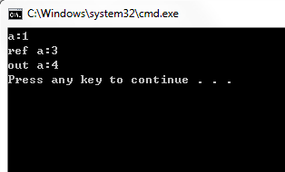 class C { //1. in型参数 public void sum(int a, int b) { a += b; } //2. ref型参数 public void sum(ref int a, int b) { a += b; } //3. out型参数 public void sum1(out int a, int b) { a = b+2; } public static void Main(string[] args) { C c = new C(); int a = 1, b = 2; c.sum(a,b); Console.WriteLine("a:{0}", a); a = 1; b = 2; c.sum(ref a, b); Console.WriteLine("ref a:{0}", a); a = 1; b = 2; c.sum1(out a, b); Console.WriteLine("out a:{0}", a); } }输出结果:
