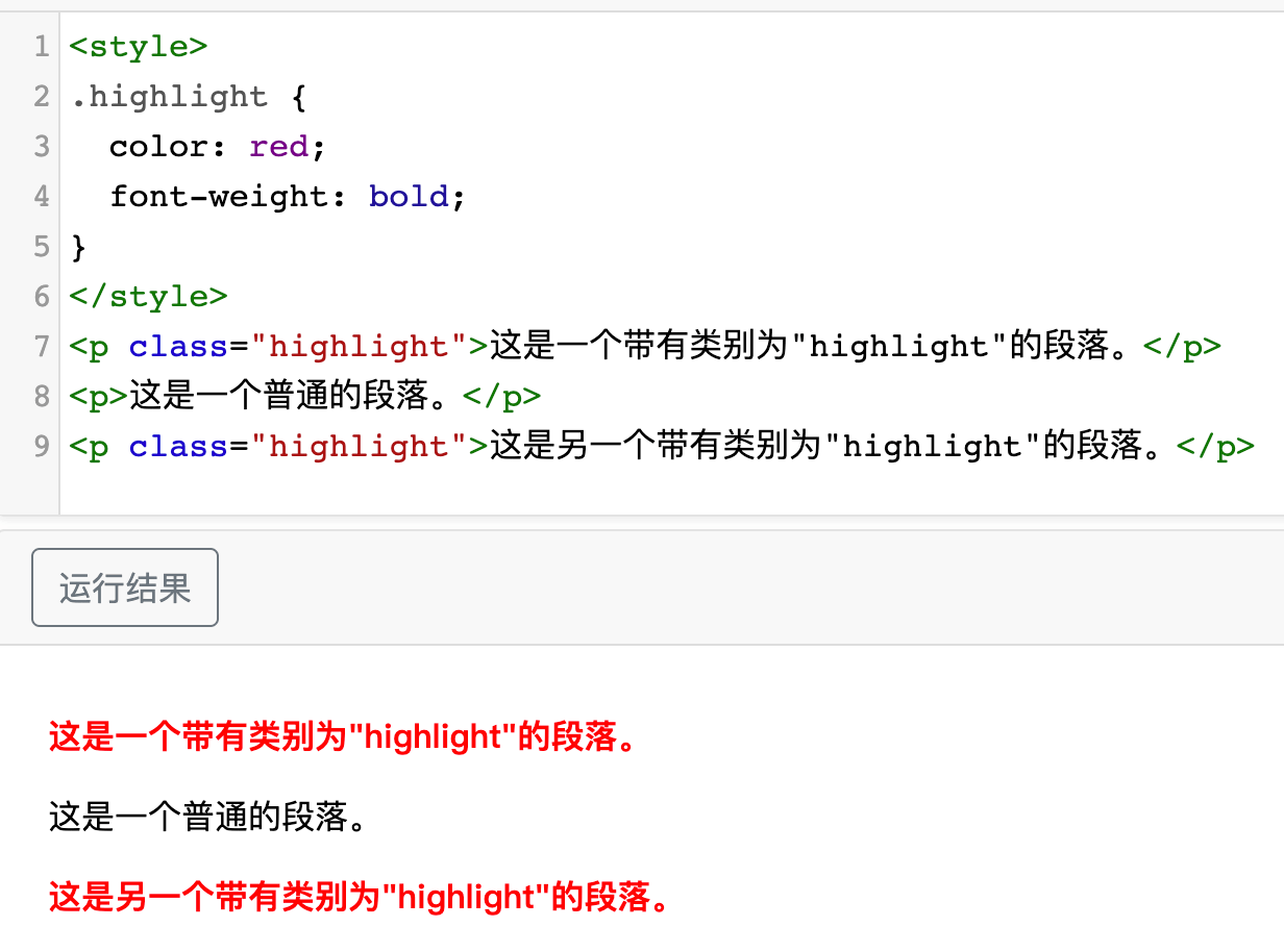 <p class="highlight">这是一个带有类别为"highlight"的段落。</p>