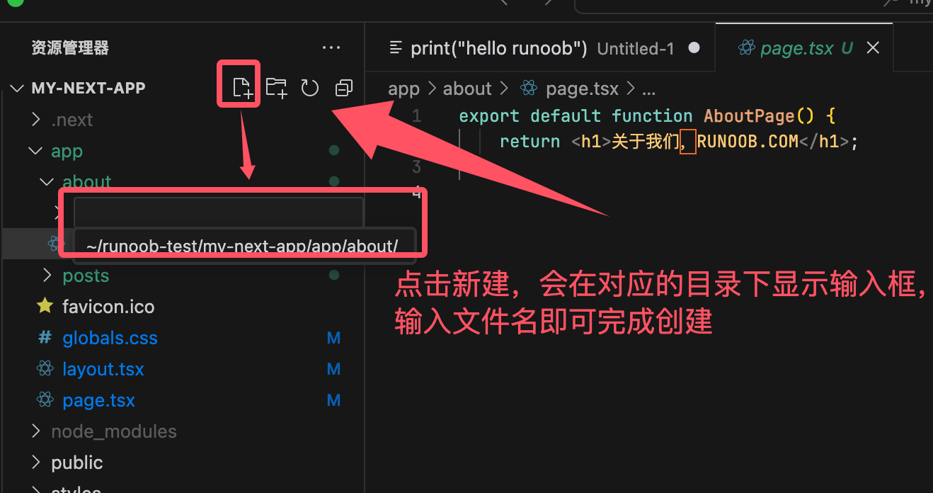 通过"资源管理器"项目上按钮来创建文件,会先出现一个输入文件名的输入框,输入文件名后即可完成创建: