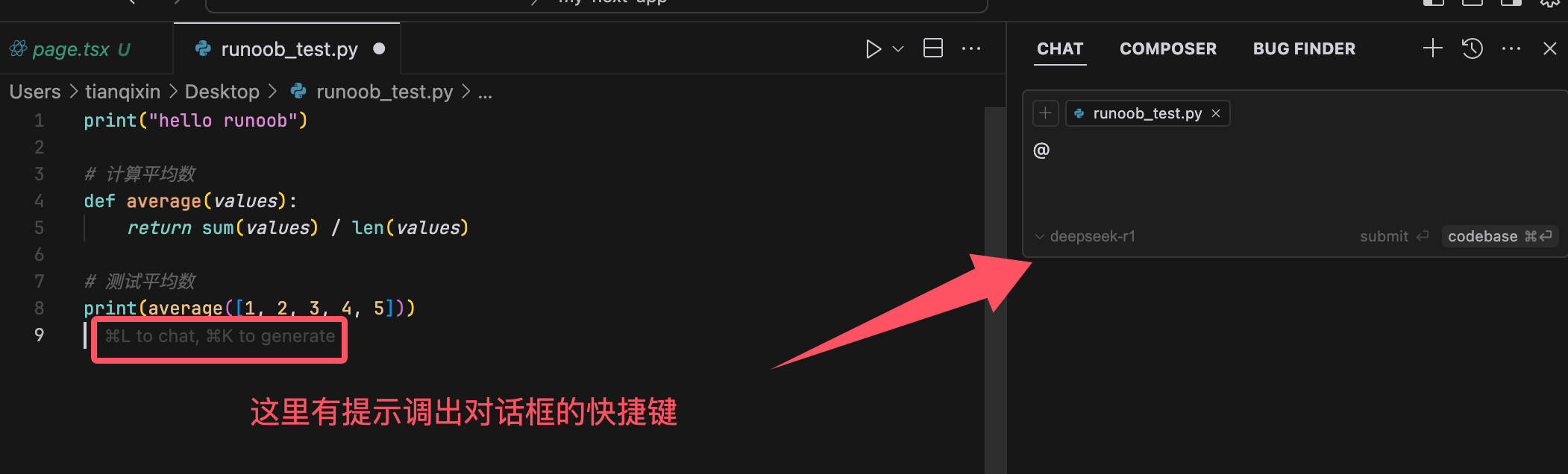 如果对代码不熟悉,需要 AI 来解析,可以通过快捷键 Cmd/Ctrl + L 来调出 AI 对话窗口: