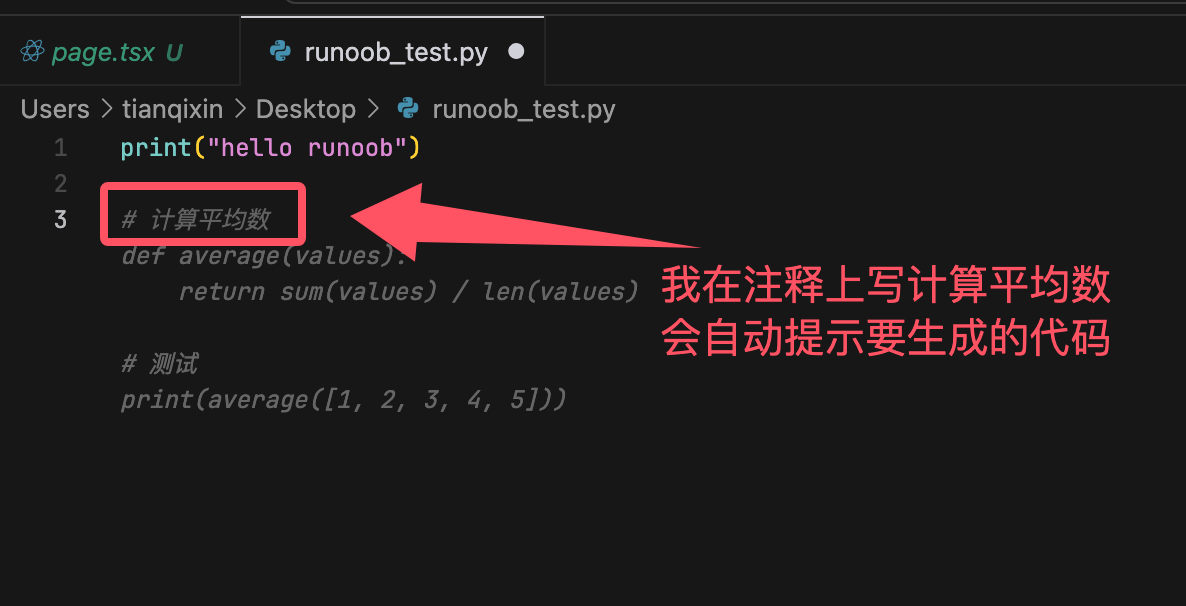 如果写上注释如 # 计算平均数 ,Cursor 就会自动帮我们实现功能,按下 Tab 键就可以才能 Cursor 提供的代码: