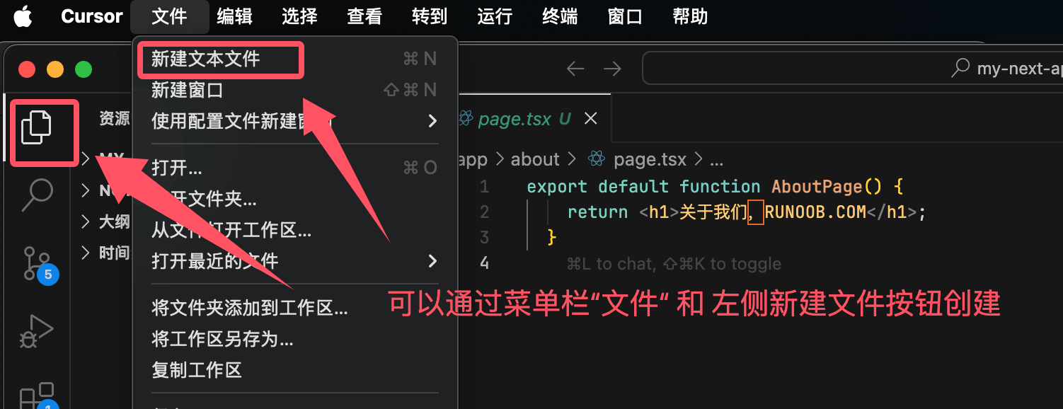 Cursor 新建文件很简单,可以点击菜单栏的"文件"或左侧的"资源管理器"来创建: