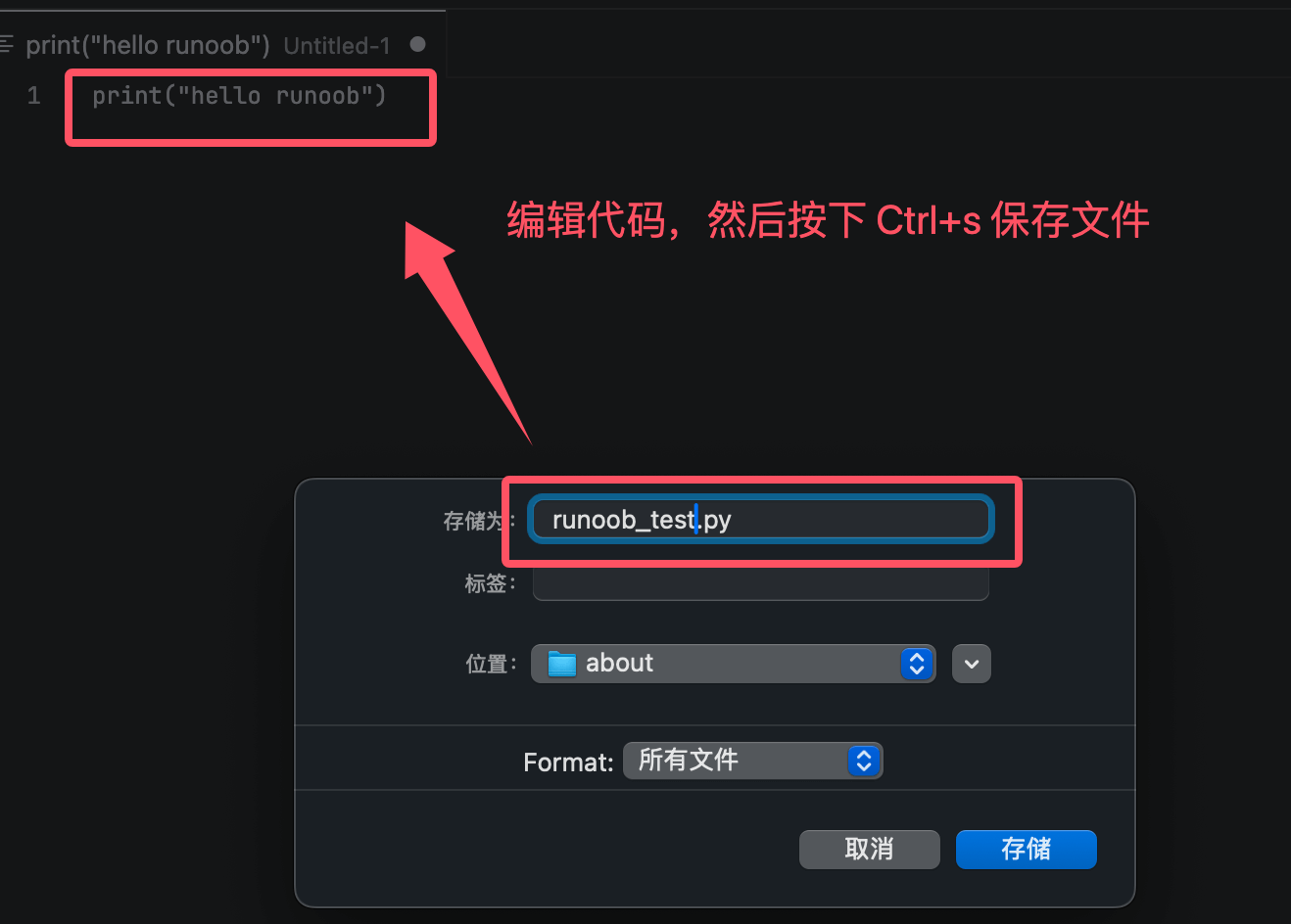 点击菜单栏的新建文件,会出现一个空文本,我们可以输入代码,并按下 Ctrl + s 来保存代码,输入文件名,并设置保存目录: