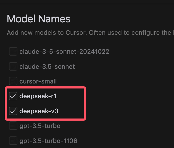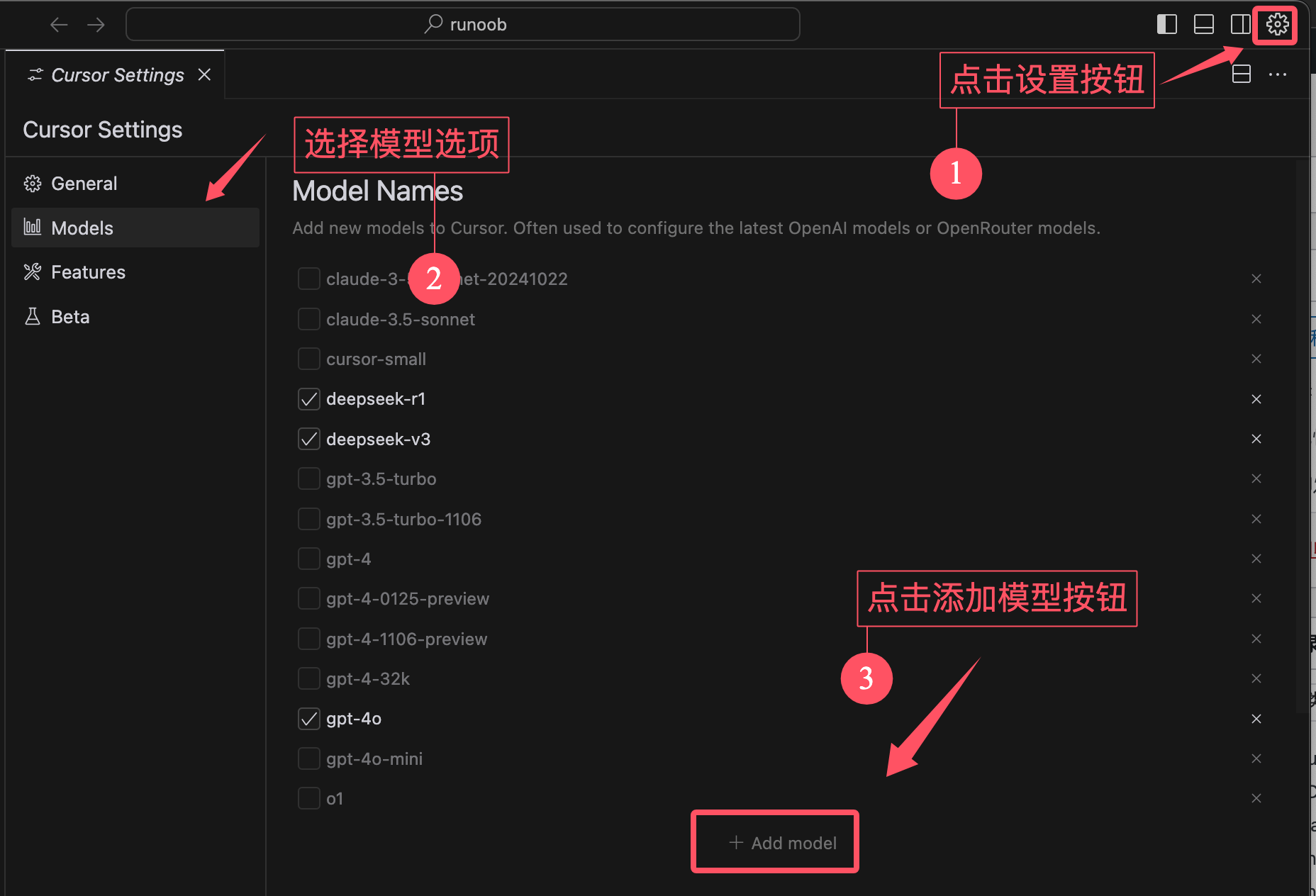 Cursor 内置了很多大模型,当然我们可以自定义设置模型,设置也非常简单。