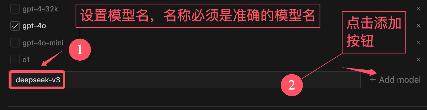 点击按钮后,会出现一个输入框,我们输入模型名,比如 deepseek-v3 及 deepseek-r1。