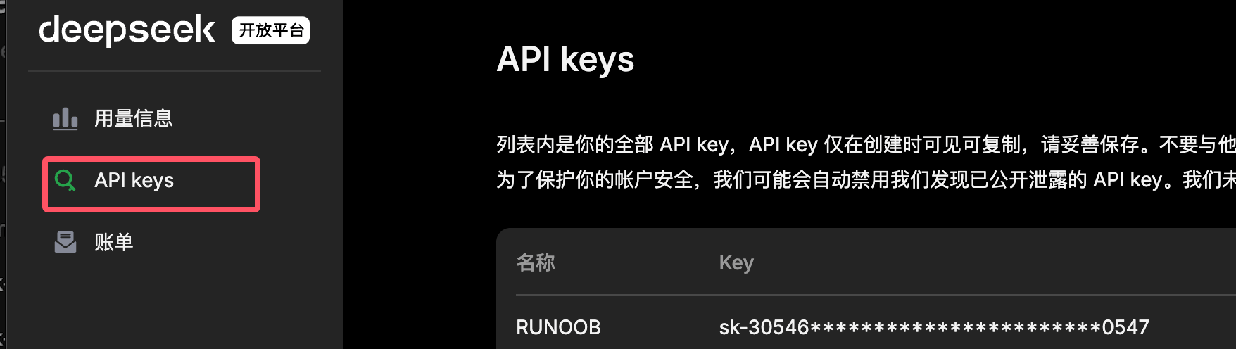 API key 和请求地需要去大模型的官方获取,当然如果第三方平台有提供的也可以,比如 DeepSeek 的可以去官方 https://platform.deepseek.com/usage 申请: