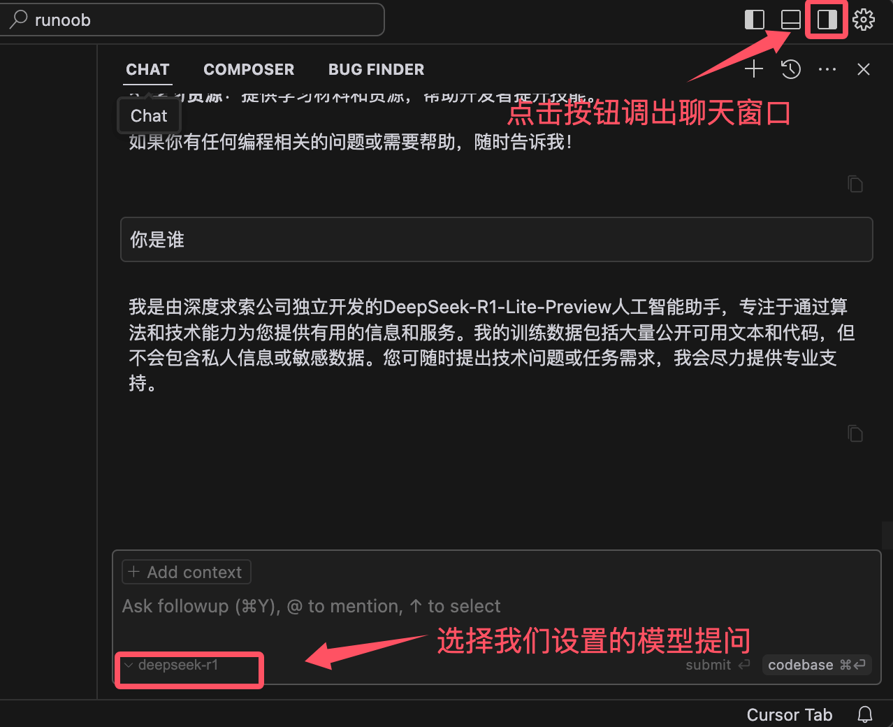 接下来我们试试对话聊天,点击右上角的小图标打开聊天窗口,然后选择 deepseek-r1 模型,就可以开始了:
