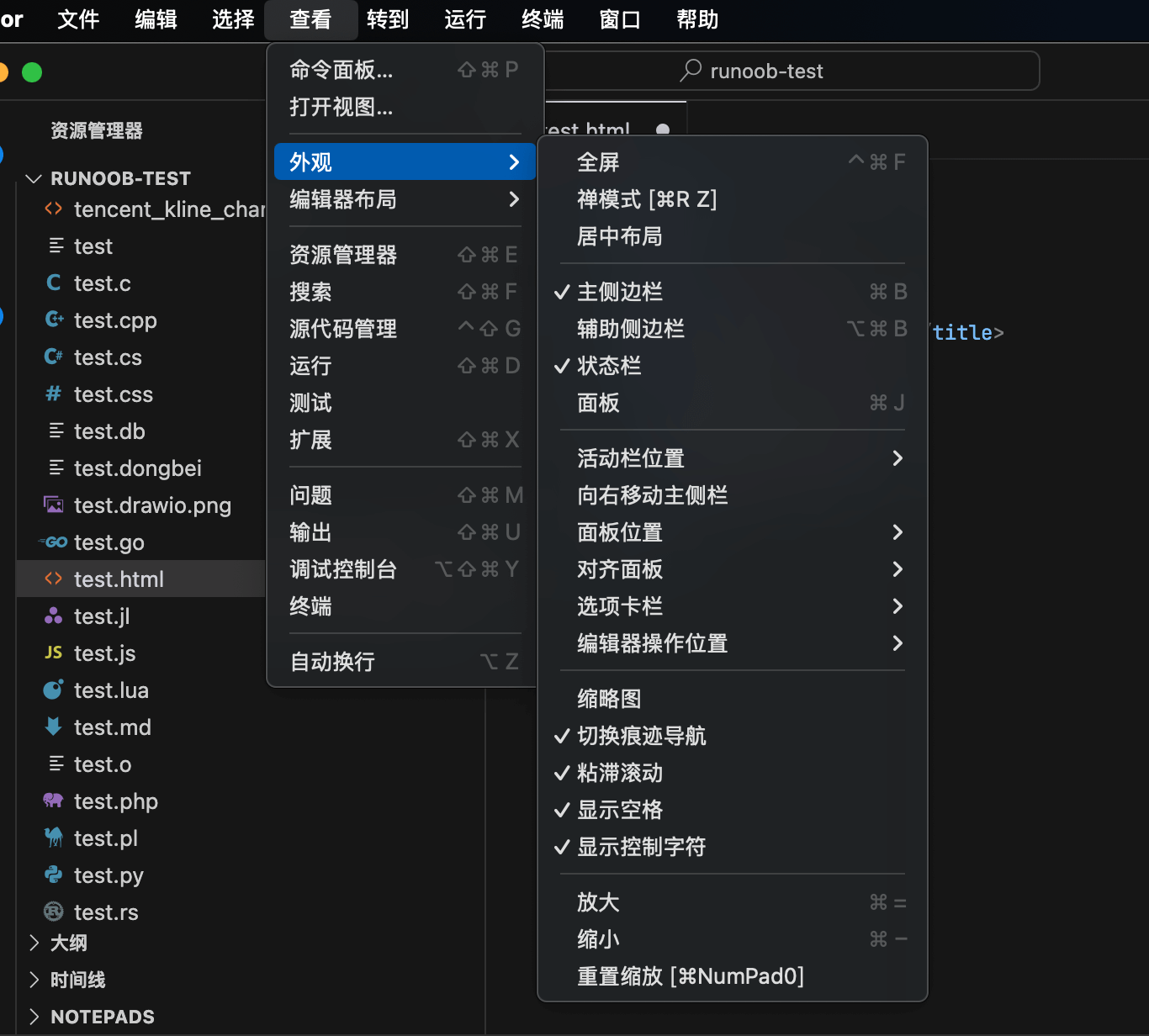 - 重置缩放:将编辑区的字体大小恢复到默认值。
