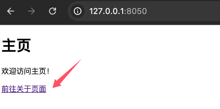 运行应用后,访问 http://127.0.0.1:8050/ 可以看到首页内容,点击 "前往关于页面" 链接可以跳转到关于页面,点击 "返回主页" 链接可以回到首页。