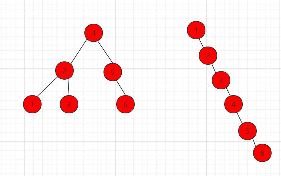 如下图所示,元素节点一样,组成两种不同的二分搜索树,都是满足定义的: