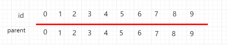 同样用数组表示并查集,但是下面一组元素用 parent 表示当前元素指向的父节点,每个元素指向自己,都是独立的。