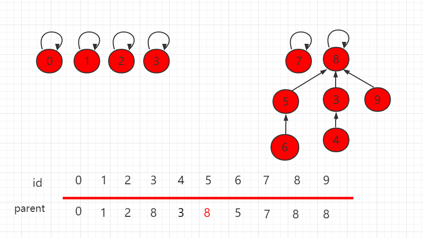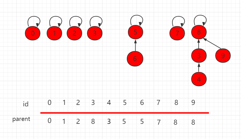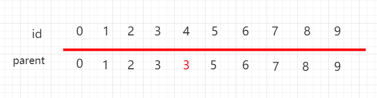 构建这种指向父节点的树形结构, 使用一个数组构建一棵指向父节点的树,parent[i] 表示 i 元素所指向的父节点。