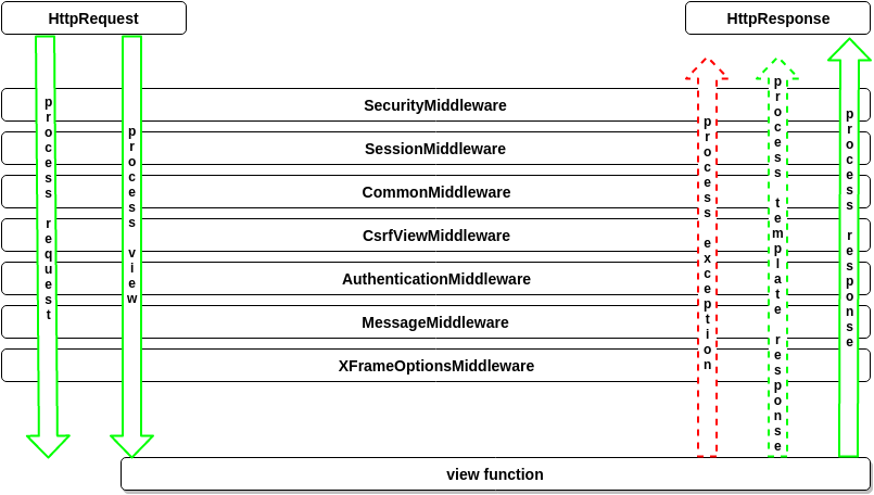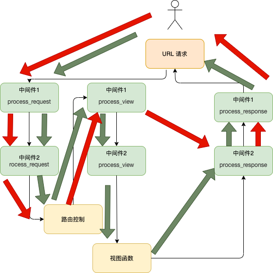 从下图看,正常的情况下按照绿色的路线进行执行,假设中间件1有返回值,则按照红色的路线走,直接执行该类下的 process_response 方法返回,后面的其他中间件就不会执行。