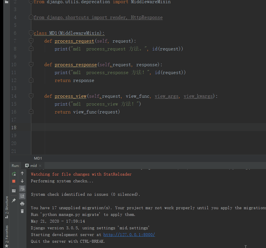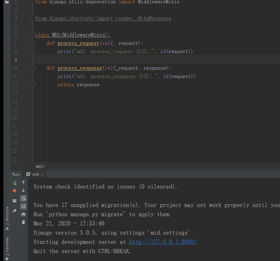 print("md1 process_request 方法。", id(request)) #在视图之前执行