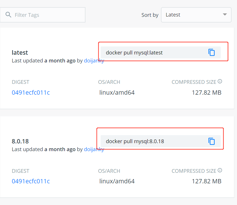 可以通过 Sort by 查看其他版本的 MySQL,默认是最新版本 mysql:latest 。