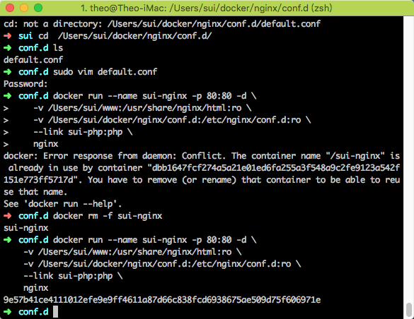 docker run --name sui-nginx -p 80:80 -d \ -v /Users/sui/www:/usr/share/nginx/html:ro \ -v /Users/sui/docker/nginx/conf.d:/etc/nginx/conf.d:ro \ --link sui-php:php \ nginx测试结果