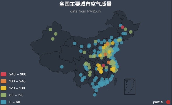 - 连续型数据自定义分段: 依据 visualMap-piecewise.pieces 来定义每块范围。