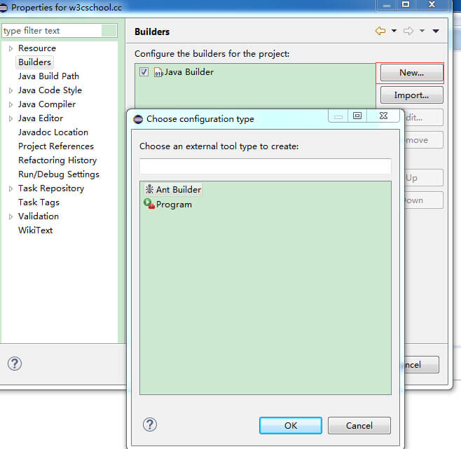 java编译器用于编译java项目。通过点 New 按钮我们可以让java项目关联 Ant builder 编译器。