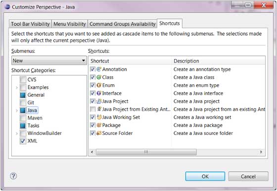 - 点击菜单栏上的 "Windows" => "Customize Perspective" => 弹出窗口,可以在"Submenus"里面选择你要设置的内容。