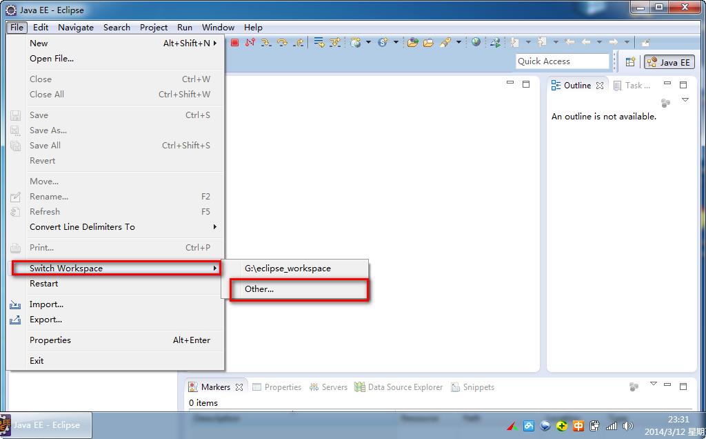 Eclipse切换工作空间可以选择菜单栏中选择 "File" => "switch workspace":