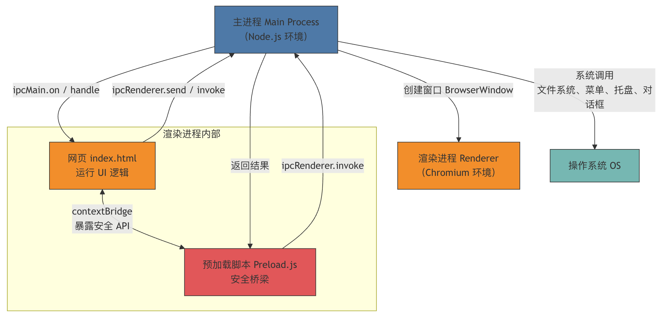 - 与系统交互需通过 IPC 通信或 preload 暴露 API。
