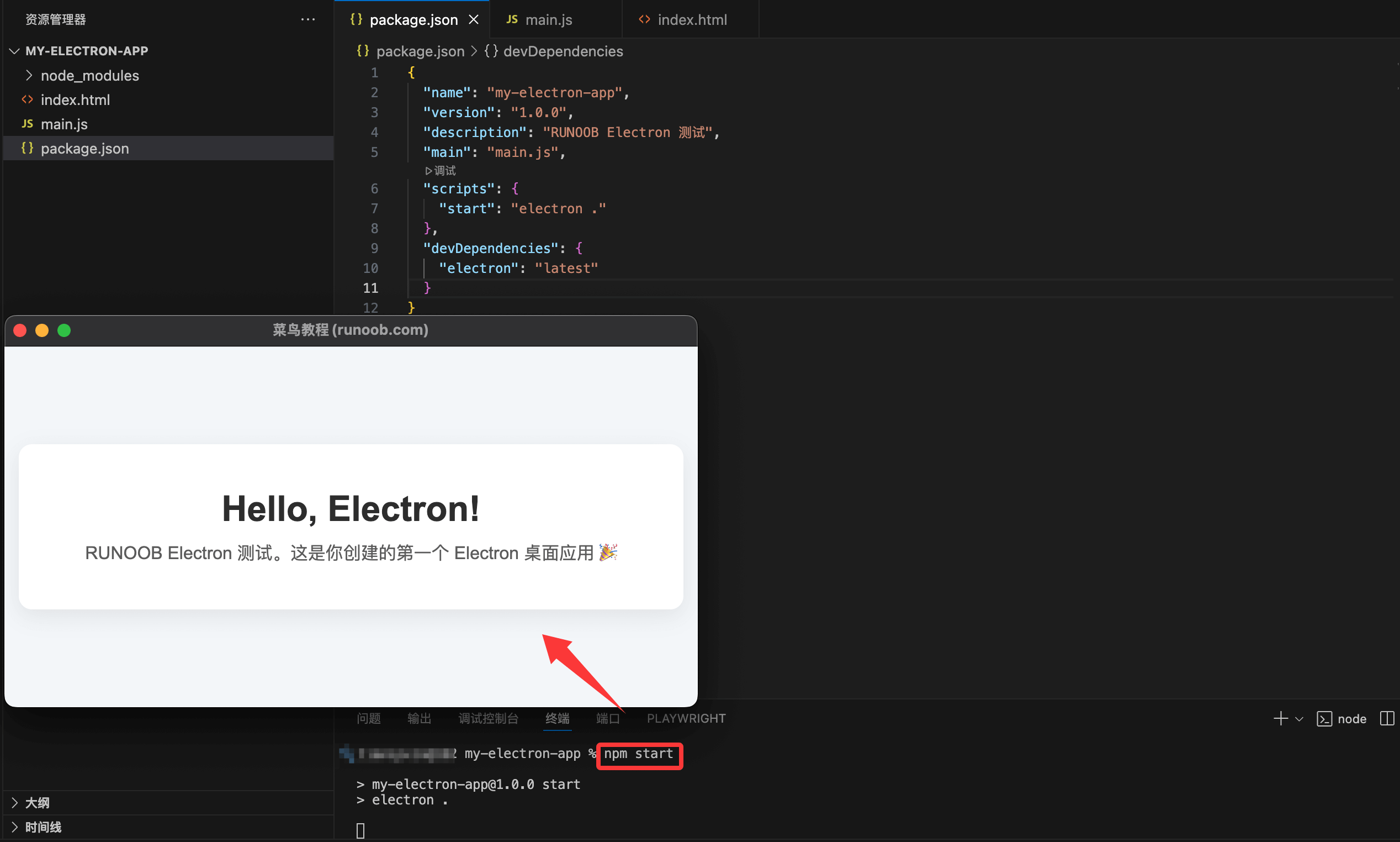 Hello, Electron! RUNOOB Electron 测试。这是你创建的第一个 Electron 桌面应用 🎉