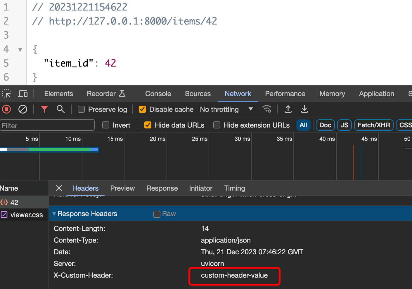 以上代码在浏览器访问 http://127.0.0.1:8000/items/42/ 页面显示如下,可以看到我们自定义的响应头: