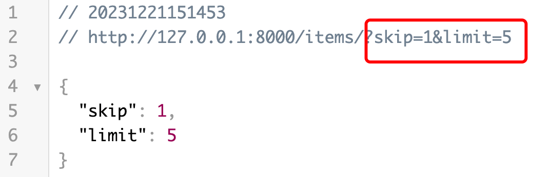 传递 GET 请求的参数 http://127.0.0.1:8000/items/?skip=1&limit=5,返回 JSON 数据如下所示:
