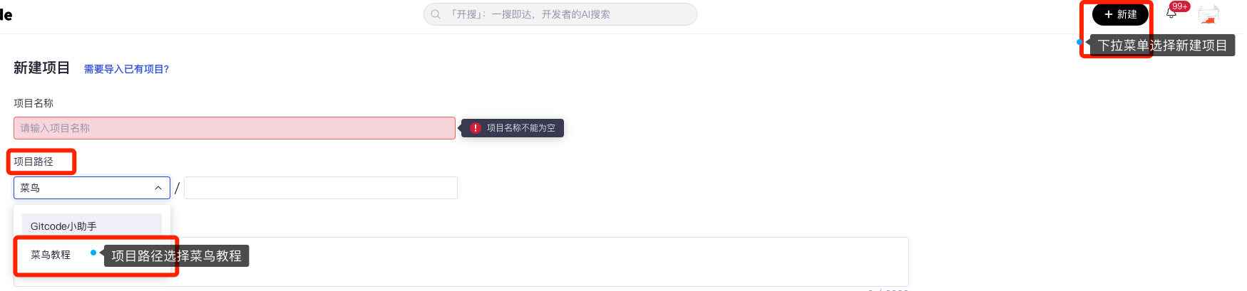 - 在创建新项目的过程中,你需要选择一个项目路径。这里建议大家将测试用的项目创建在"菜鸟教程"组织下。