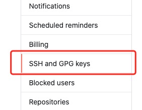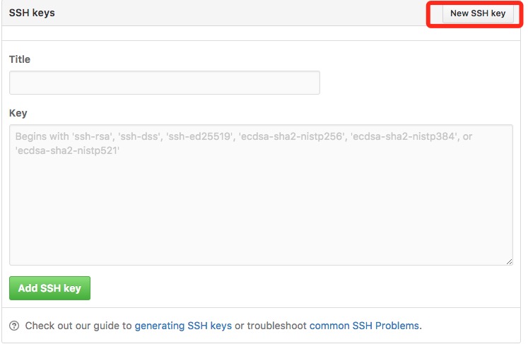 左边选择 SSH and GPG keys,然后点击 New SSH key 按钮,title 设置标题,可以随便填,粘贴在你电脑上生成的 key。