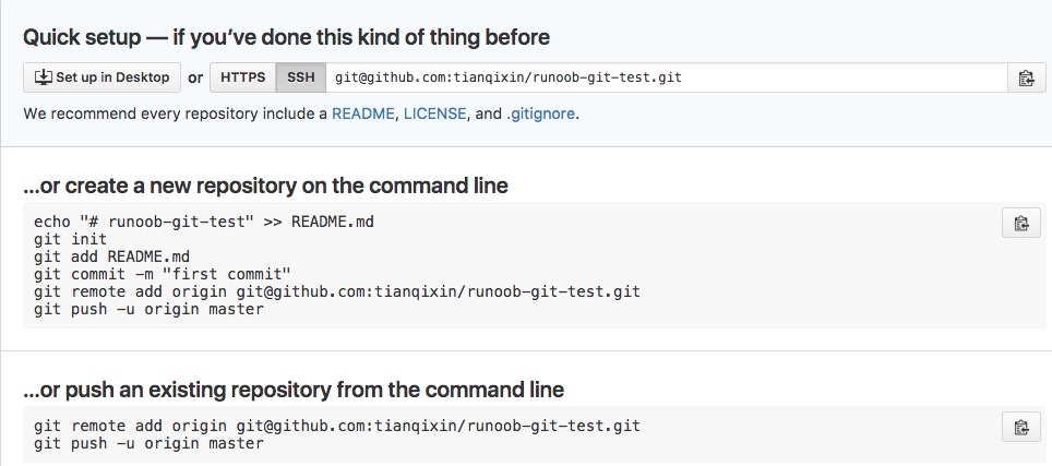 $ mkdir runoob-git-test # 创建测试目录 $ cd runoob-git-test/ # 进入测试目录 $ echo "# 菜鸟教程 Git 测试" >> README.md # 创建 README.md 文件并写入内容 $ ls # 查看目录下的文件 README $ git init # 初始化 $ git add README.md # 添加文件 $ git commit -m "添加 README.md 文件" # 提交并备注信息 [master (root-commit) 0205aab] 添加 README.md 文件 1 file changed, 1 insertion(+) create mode 100644 README.md # 提交到 Github $ git remote add origin git@github.com:tianqixin/runoob-git-test.git $ git push -u origin master