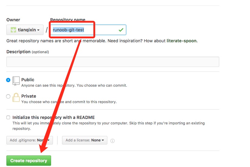之后在在Repository name 填入 runoob-git-test(远程仓库名) ,其他保持默认设置,点击"Create repository"按钮,就成功地创建了一个新的Git仓库: