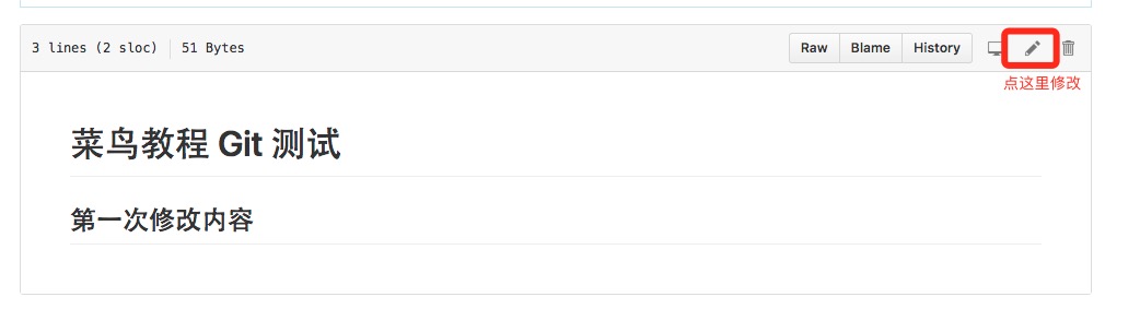 $ cat README.md # 菜鸟教程 Git 测试 ## 第一次修改内容