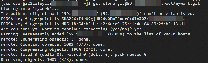 $ git clone git@192.168.45.4:/home/gitrepo/runoob.git Cloning into 'runoob'... warning: You appear to have cloned an empty repository. Checking connectivity... done.