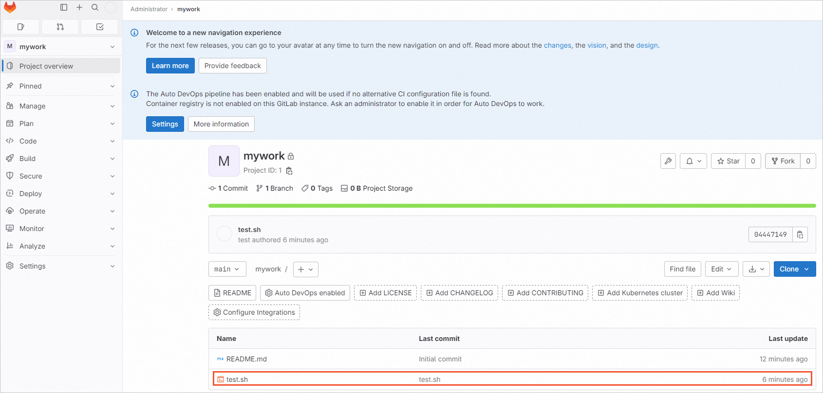 在网页中查看上传的 test.sh 文件已经同步到 GitLab 服务器中: