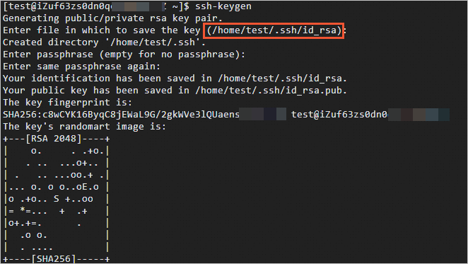 生成密钥对的过程中,系统会提示输入密钥对存放目录(默认为当前用户目录下的 .ssh/id_rsa,例如 /home/test/.ssh/id_rsa)和密钥对密码,您可以手动输入,也可以按 Enter 保持默认。