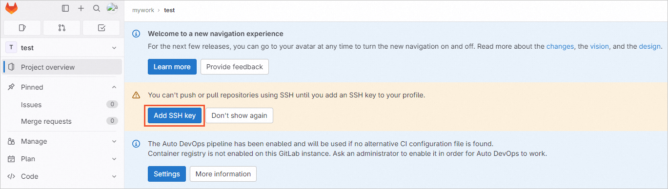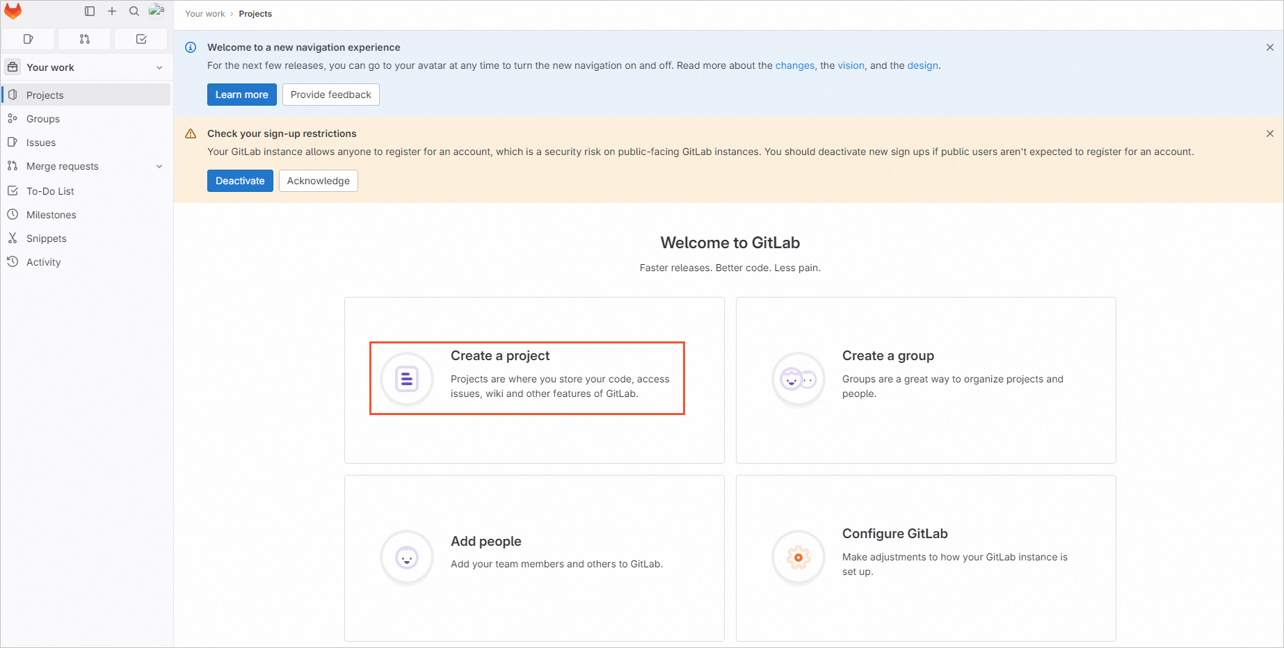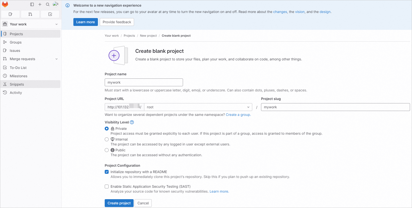 登录 GitLab,创建一个新的项目,用户名为 root。