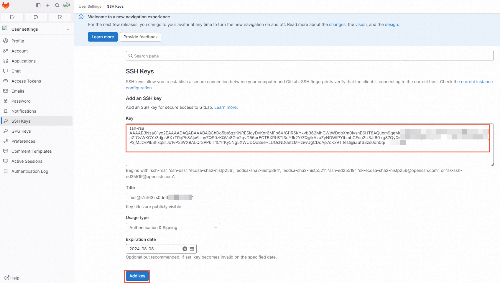 将公钥文件 id_rsa.pub 中的内容粘贴到 Key 所在的文本框中: