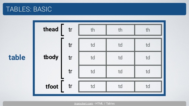 每个表格均有若干行(由 <tr> 标签定义),每行被分割为若干单元格(由 <td> 标签定义),表格可以包含标题行(<th>)用于定义列的标题。