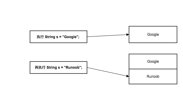 原因在于实例中的 s 只是一个 String 对象的引用,并不是对象本身,当执行 s = "Runoob"; 创建了一个新的对象 "Runoob",而原来的 "Google" 还存在于内存中。