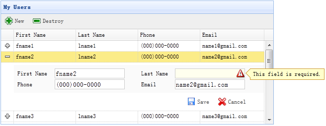 <form method="post"> <table class="dv-table" style="width:100%;background:#fafafa;padding:5px;margin-top:5px;"> <tr> <td>First Name</td> <td><input name="firstname" class="easyui-validatebox" required="true"></input></td> <td>Last Name</td> <td><input name="lastname" class="easyui-validatebox" required="true"></input></td> </tr> <tr> <td>Phone</td> <td><input name="phone"></input></td> <td>Email</td> <td><input name="email" class="easyui-validatebox" validType="email"></input></td> </tr> </table> <div style="padding:5px 0;text-align:right;padding-right:30px"> <a href="#" class="easyui-linkbutton" iconCls="icon-save" plain="true" onclick="saveItem(<?php echo $_REQUEST['index'];?>)">Save</a> <a href="#" class="easyui-linkbutton" iconCls="icon-cancel" plain="true" onclick="cancelItem(<?php echo $_REQUEST['index'];?>)">Cancel</a> </div> </form>