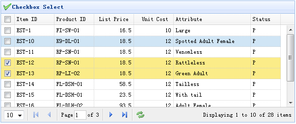 <table id="tt" title="Checkbox Select" class="easyui-datagrid" style="width:550px;height:250px" url="data/datagrid_data.json" idField="itemid" pagination="true" iconCls="icon-save"> <thead> <tr> <th field="ck" checkbox="true"></th> <th field="itemid" width="80">Item ID</th> <th field="productid" width="80">Product ID</th> <th field="listprice" width="80" align="right">List Price</th> <th field="unitcost" width="80" align="right">Unit Cost</th> <th field="attr1" width="100">Attribute</th> <th field="status" width="60" align="center">Status</th> </tr> </thead> </table>